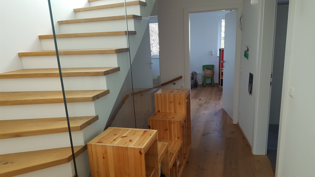 Our house was built in 2017 and is in a quiet and green neighbourhood. Still, you can get to the citycenter by public transport in less than half an hour. There is an open kitchen-dining-leaving area on the ground floor, and a bathroom with shower and WC. On the first floor there are three children rooms, each with a full size bed, as well as a bathroom with shower and bathtub and a separate WC. On the second floor there is a bedroom and the terasse with a nice view on the city of Vienna. Additionally, there is a big cellar with a guest room and a room with the washing maschine etc. We have a little garden behind the house.