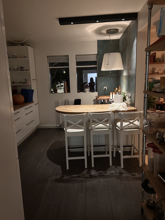 From the living room is an entrance door to the garden where you’ll find some beautiful trees, and a small lawn, a bbq, a trampoline and some toys for the kids and also greenhouse, some herbs and berries. in summertime that is.