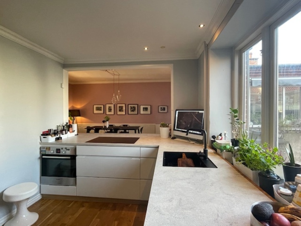 Lejligheden består af to afdelinger; den sociale afdeling med køkken-alrum/spisestue samt stue, smagfuldt indrettet med kunst og litteratur. Den stille, private afdeling har 2 soveværelser og bad.