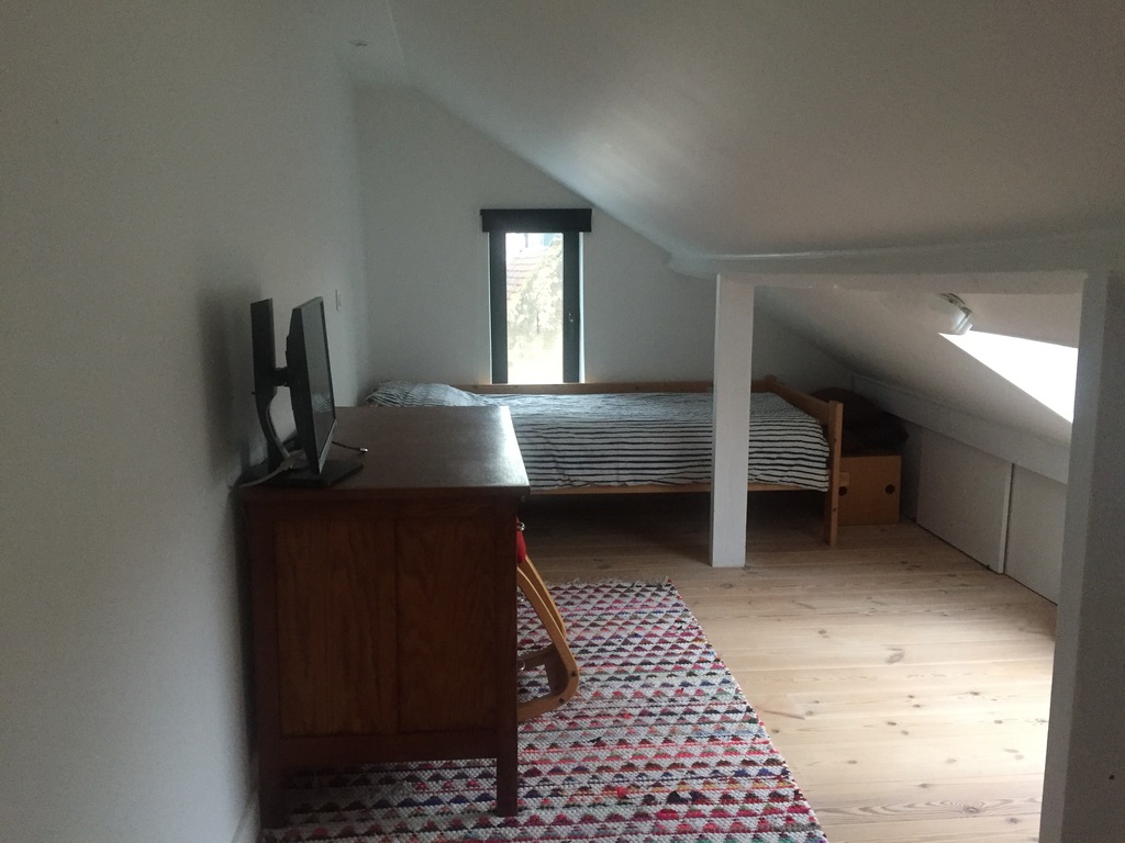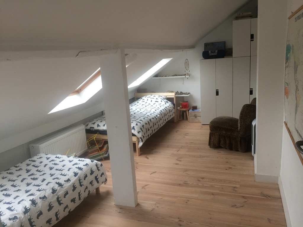 Upstairs we have a bedroom with a double bed, a single bedroom, bathroom and toilet. In the attic we have 2 children's bedrooms.