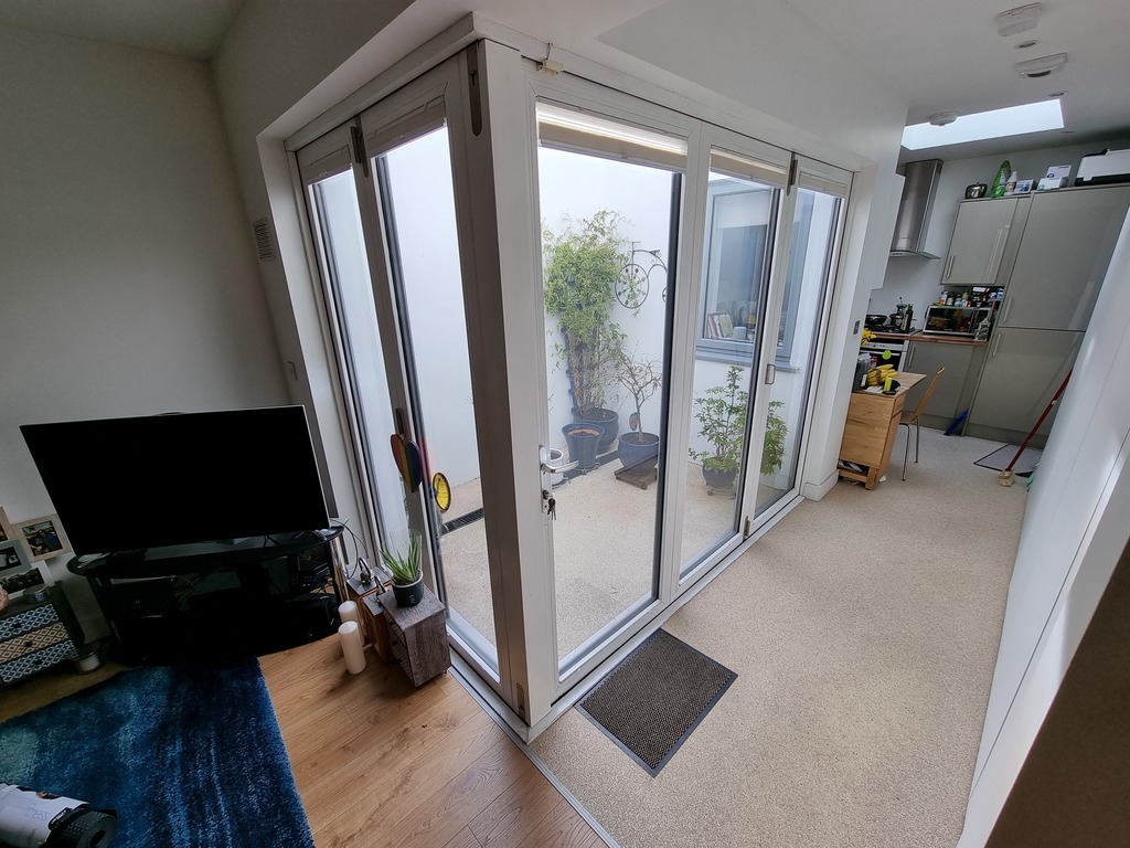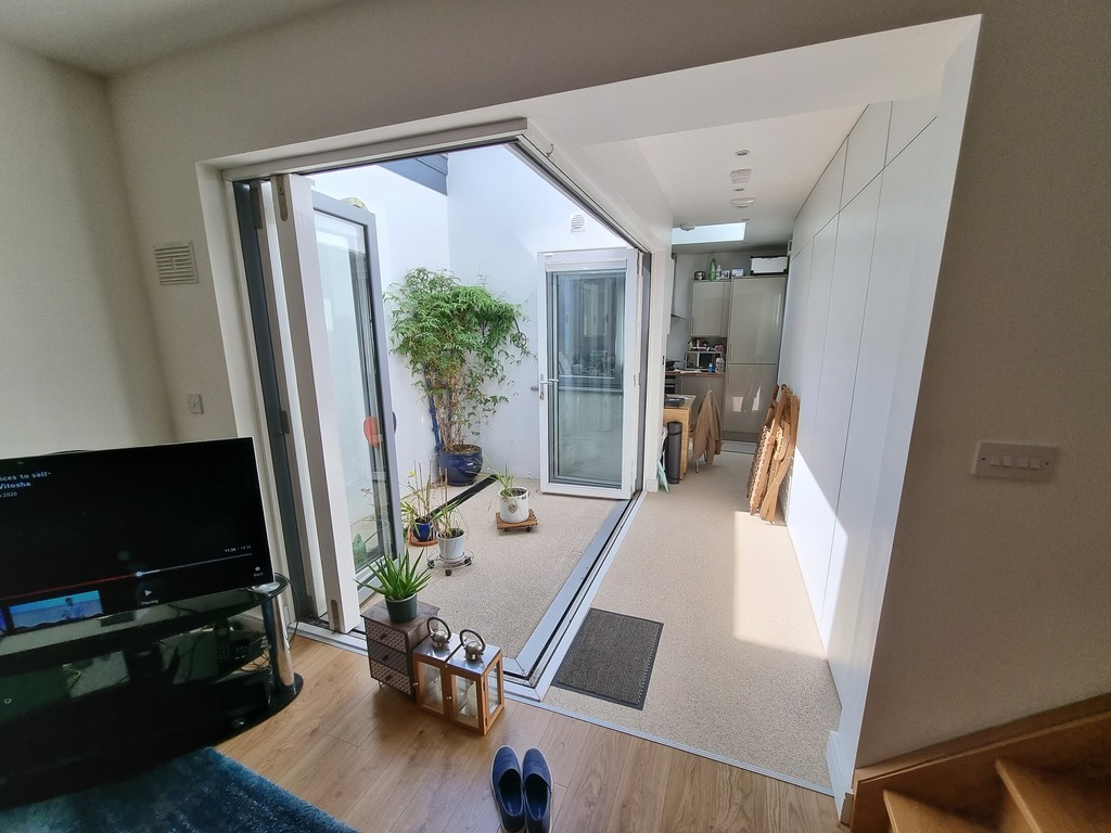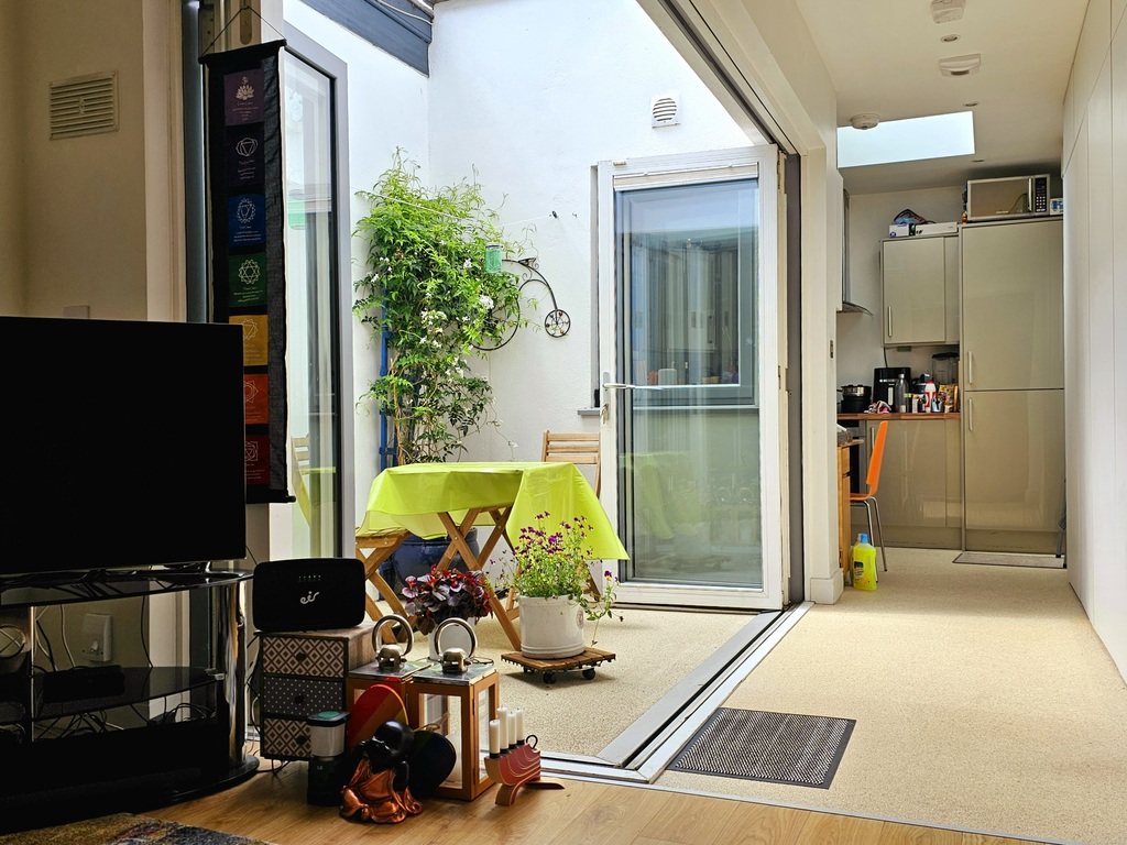 The property comprises of a hallway leading to the open plan bright living room with internal courtyard and corridor to a compact kitchen. The kitchen is fully equipped. There is a downstairs WC and washing and tumble dryer. The stairs leads to 2 double bedrooms (a main and guest room). There is a large modern bathroom with walk in shower. There is also a storage area to the rear and a small private yard. The property was completely rebuilt in 2013 so is very modern and B1 energy rated.